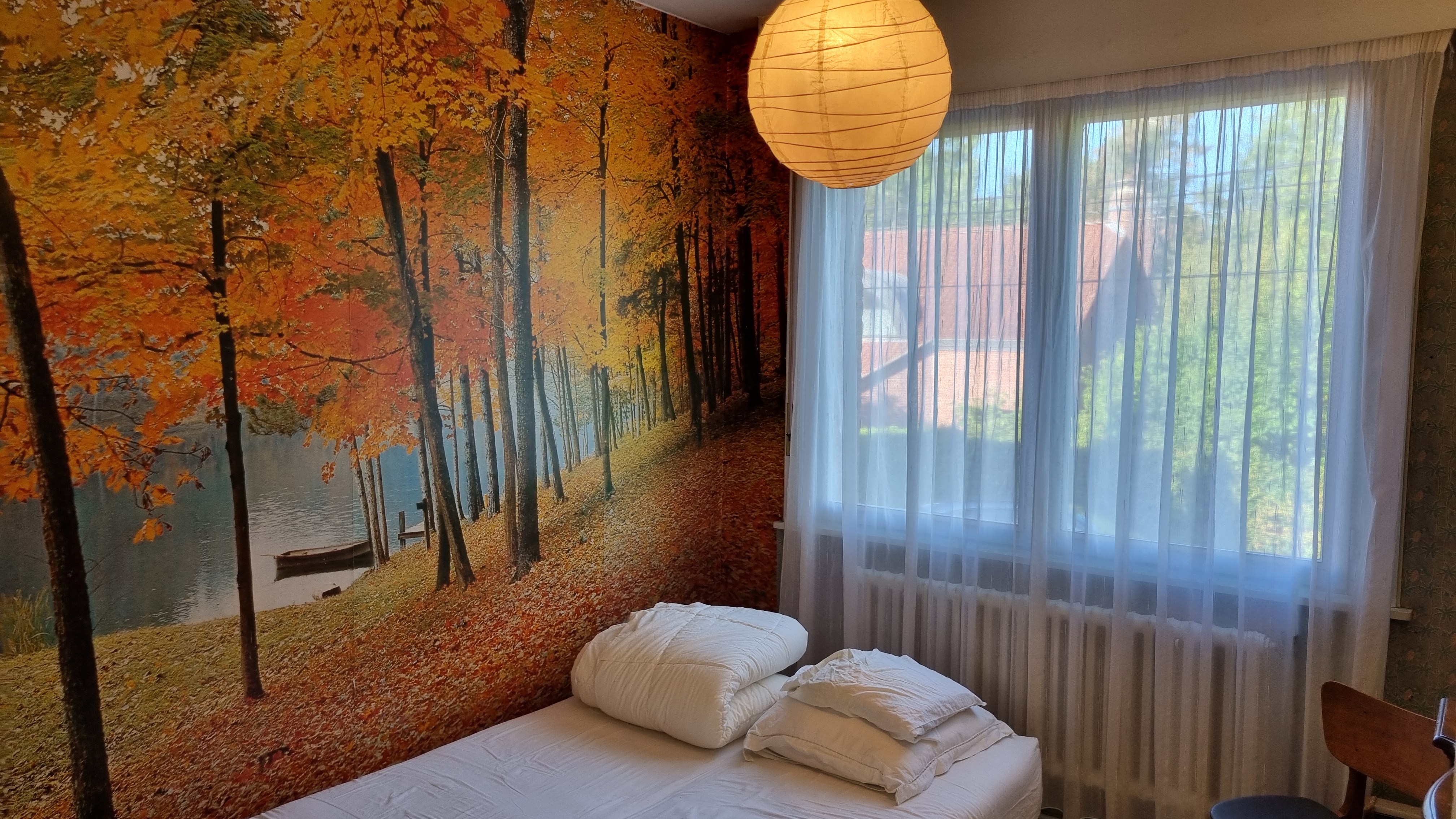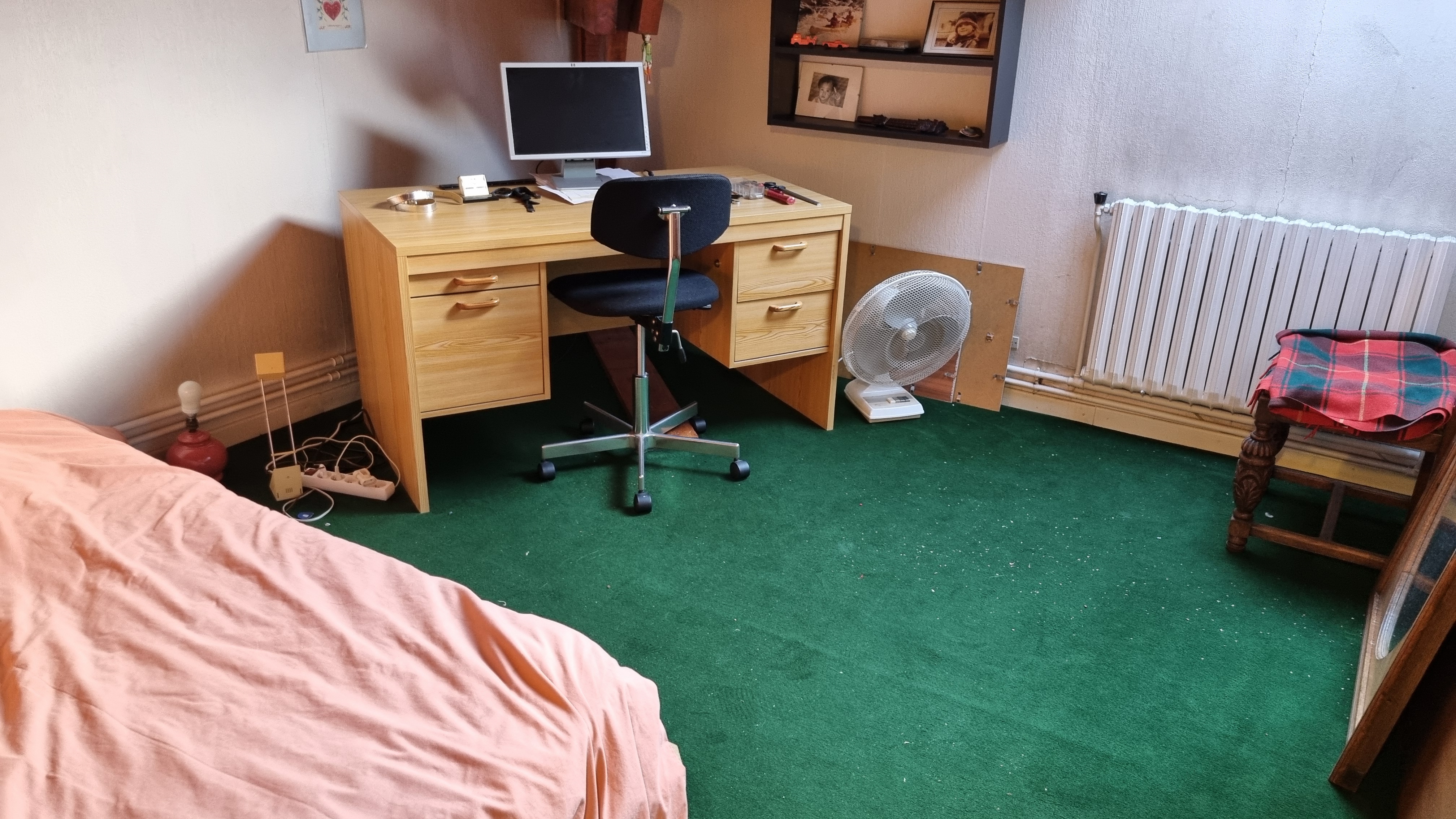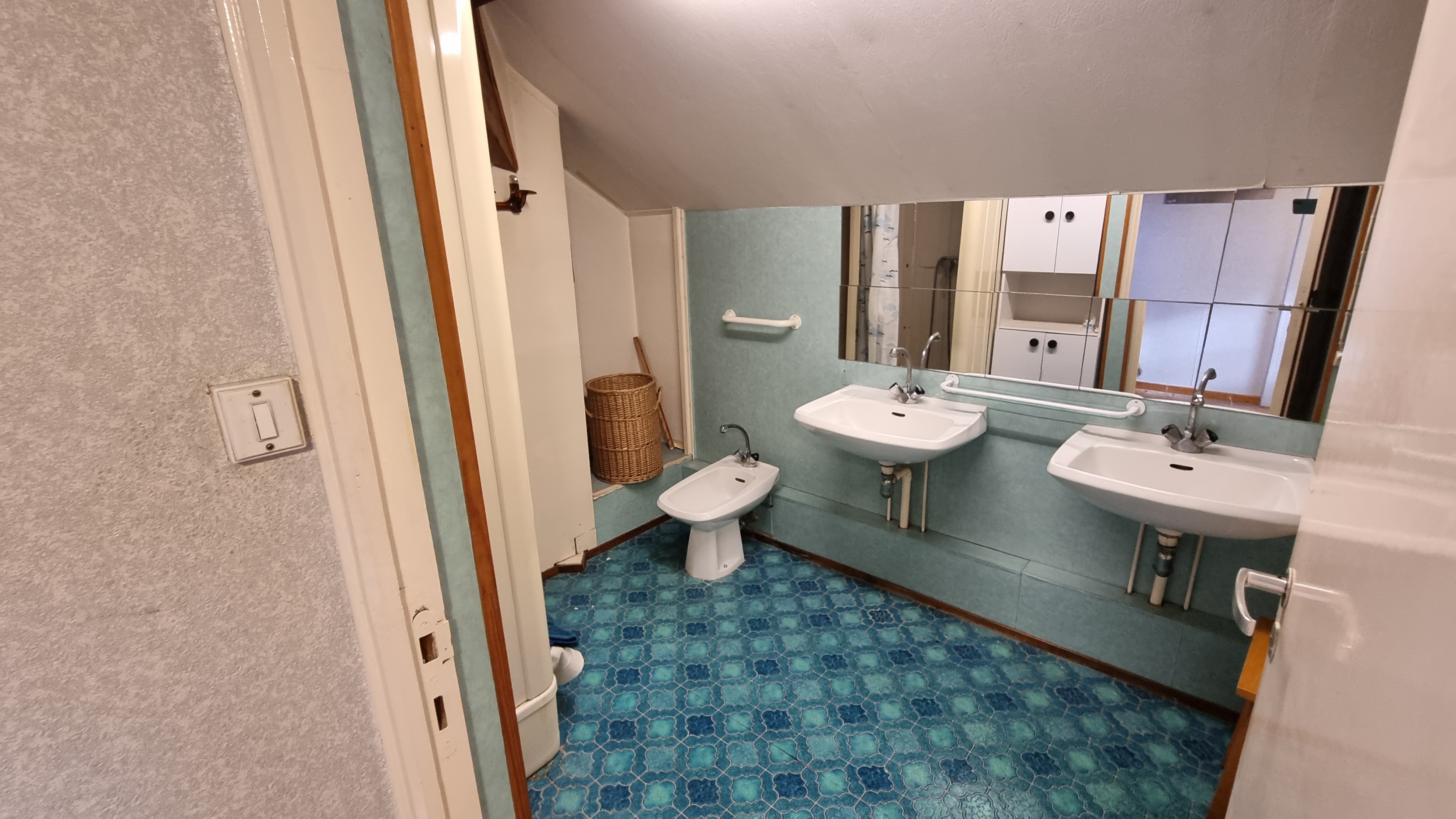 Demi étage: palier-couloir vers une salle bain avec toilettes broyeur, trois chambres de 15m² (communiquant avec la salle de bain), 9m² et 9 m²