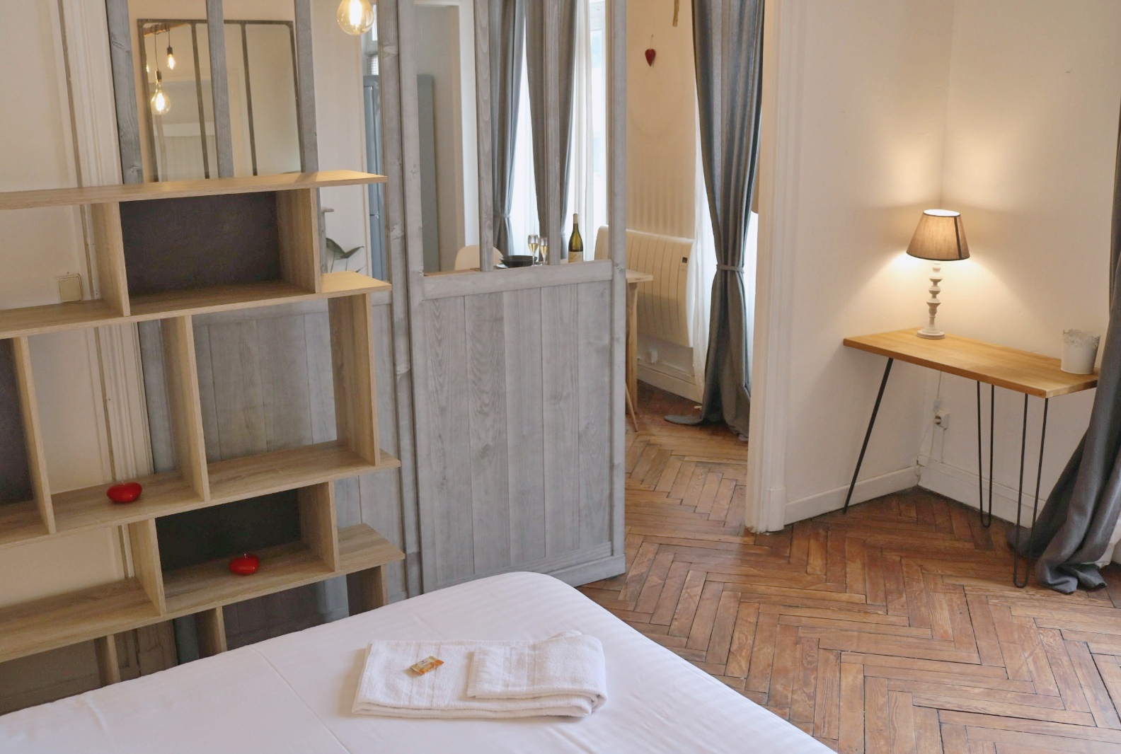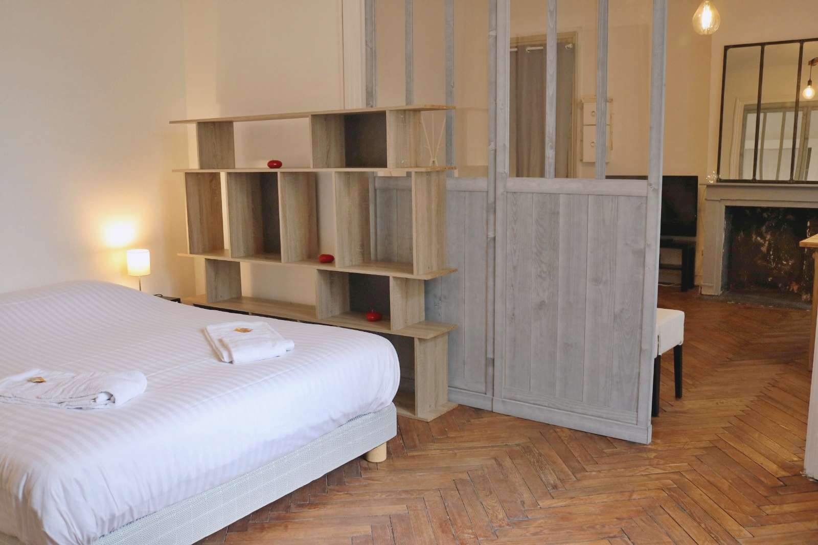 * le coin chambre: avec un lit double en 160x200 cm, deux tables de chevet et des placards de rangement