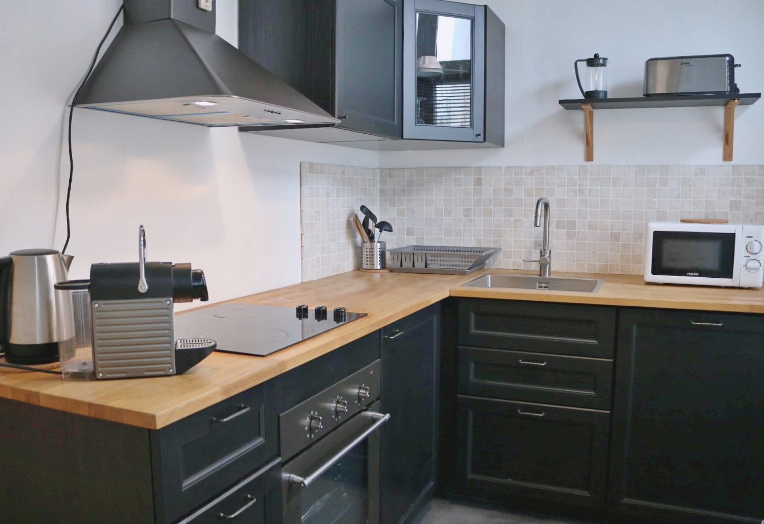 * la cuisine: avec un réfrigérateur/congélateur grand modèle, trois plaques de cuisson, un four, un lave-vaisselle, un micro-ondes