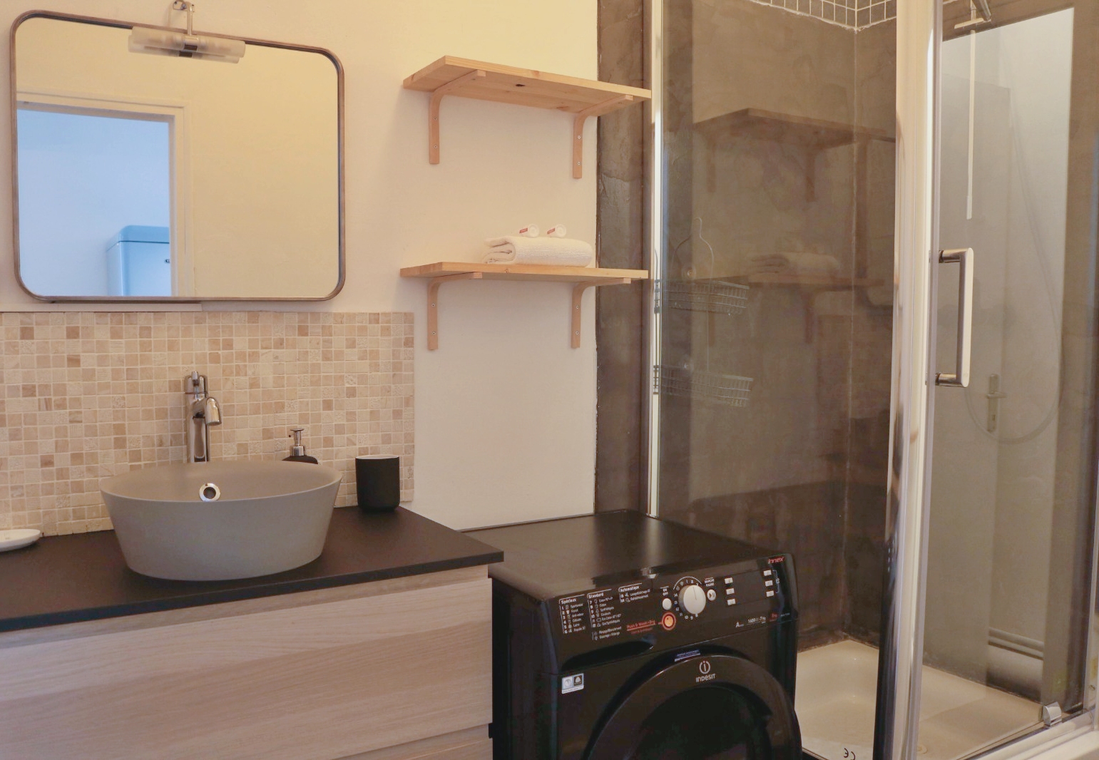 * la salle de bain avec un meuble vasque, un miroir, une douche, une machine à laver séchante